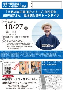 2023年10月19日 / 最終更新日時 : 2023年10月20日 kanri お知らせ10/27、飯野和好先生の絵本読み語りトークライブがあります飯野和好さん 絵本読み語りトークライブのお知らせを頂きました。☆ ☆ ☆ ☆ ☆ 絵本[八助の寺子屋日記]その一話その二話、出版記念トークライブ案内で失礼致します。 10月27日pm 18:00より、神保町ブックハウスカフェ。¥2000.- お出かけ頂けますと、幸いです。 お待ち致しております。