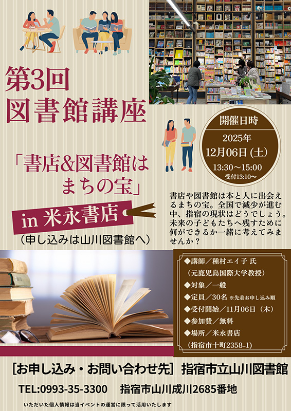 2025年12月4日 / 最終更新日時 : 2025年12月4日 kanri お知らせ2025年12/6、指宿市立山川図書館で種村エイ子先生の講座があります指宿市立山川図書館で種村先生の講座があります。 お知らせを頂いたので、ご興味のある方はどうぞ!☆ ☆ ☆ ☆ ☆